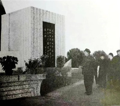 毛主席拾级而上,来到了东侧一座碑石前,上面竖排镌刻着刘伯承同志的题词“为人民解放事业而英勇牺牲的烈士们在新中国历史上其创业垂统定永远不朽”。