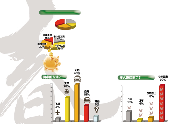 羊城晚报讯 记者 戴曼曼 报道:俗话说:有钱没钱,回家过年。但回家过年就意味着各种开销,面对着迟迟不愿“鼓”起来的钱包,你还敢回家么?近日,羊城晚报联合金羊网展开问卷调查,611名网友参与了调查。70%的网友表示今年过年将会回家,但57%的网友则表示,春节如果回家,最害怕赚钱太少不够用。那回家到底要花多少钱?近八成的网友表示,自己过年回家的花费已经超过了自己一个月以上的收入。