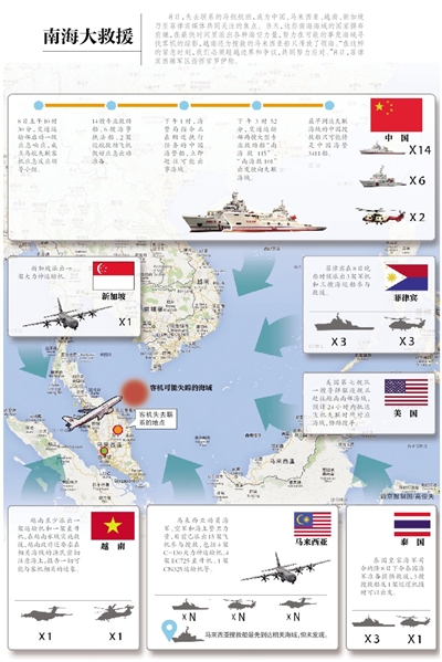 8日,失去联系的马航航班,成为中国、马来西亚、越南、新加坡乃至菲律宾媒体共同关注的焦点。当天,这些南海海域的国家摒弃前嫌,在最快时间里派出各种海空力量,努力在可能的事发海域寻找客机的踪影,越南还为搜救的马来西亚船只开放了领海。“在这样的紧急时刻,我们必须超越边界和争议,共同努力应对。”8日,菲律宾西部军区指挥官罗伊称。