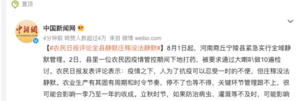 据悉,8月1日起,河南商丘宁陵县紧急实行全域静默管理。2日,县里一位农民因疫.情管控期间下地打药,被要求通过大喇叭做十遍检讨。