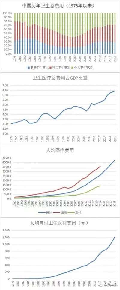 根据《新中国统计五十年资料汇编》的数据(这是目前学界公认最权威的官方数据):从1961到1989 年,中国每年卫生预算支出占财政总预算支出的比例平均为 3.61%,最高为 6.62%,最低为 2.11%;从1990到1999 年,每年卫生预算支出占财政总预算支出的比例平均为 1.40%,最高为 2.66%,最低为 0.41%。