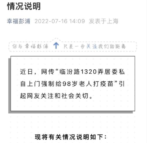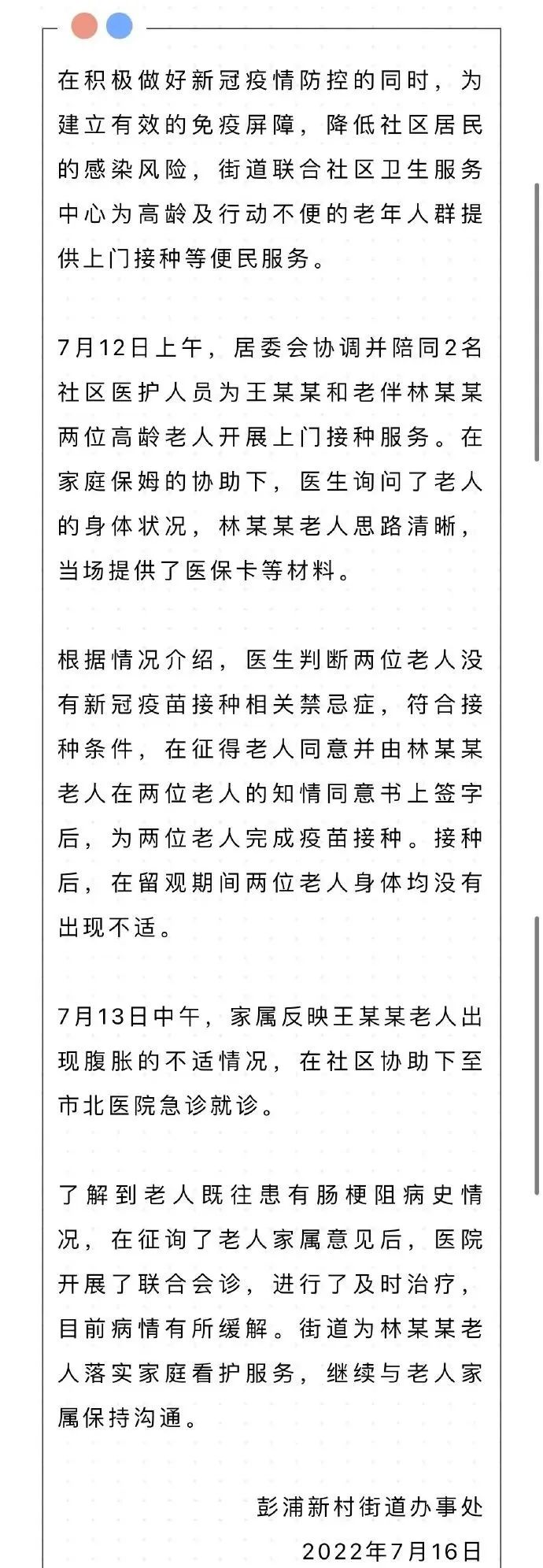 这件事在网络上引发热议后,当地ZF在7月16日做出了回应。回应中称这是“街道联合社区卫生服务中心为高龄及行动不便的老年人群提供上门接种等便民服务”。文中还表示:“在家庭保姆的协助下,医生询问了老人的身体状况,林某某老人思路清晰,当场提供了医保卡等材料。随后在征得同意后并在知情同意书上签字后,两位老人完成疫苗接种。”