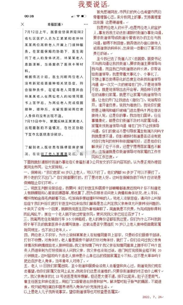老人家属发布的那个视频中,其表示,两位老人的自主思考能力已经很弱了,是无法确认自己可以打疫苗这件事的,而居委工作人员也没能拿出老人签的知情同意书。