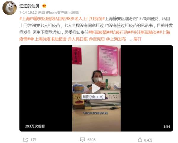 7月中旬,老人的家属在网络上发声,称上海某地居委私自上门给两位90多岁的老人打疫苗,其中一位老人98岁,卧床还耳背,另一位老人92岁,患有阿茨海默症。98岁的老爷爷在接种第二天,并发症发作,被送至医院,医生下了病危通知书。后家属找到居委质询,但居委却不认为自己有责任。(参考阅读:98岁老人被“上门接种”后病危,谁之过?)