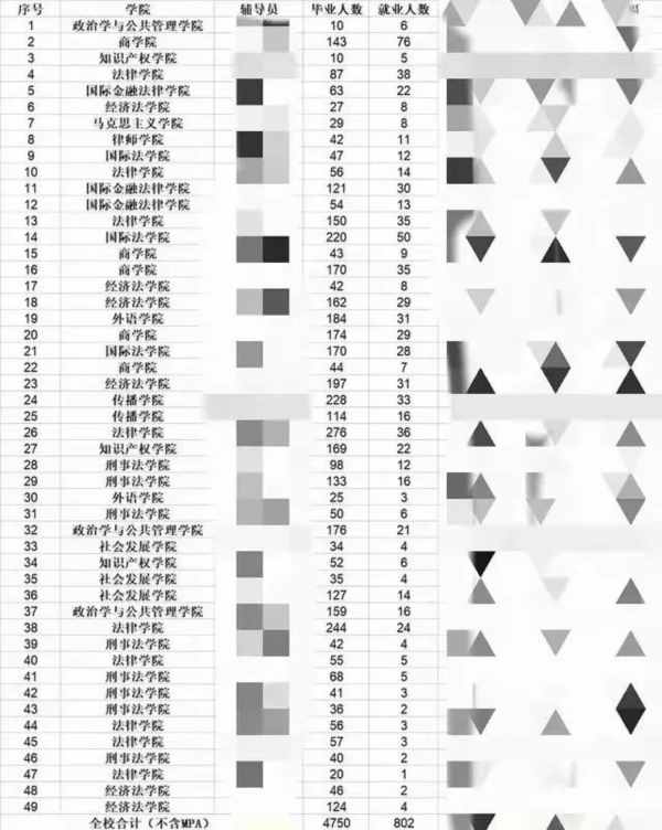 不仅是传统理工科的专业,文科类的专业更是艰难。根据一份某政法大学流出的表格截图显示,今年法学各专业的学生只有六分之一的学生找到了工作。即使除开因考研而暂时不就业的学生,这个数据也是十分惊人的。