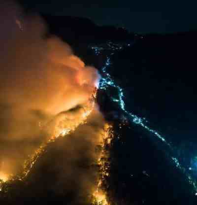 而那条蓝光是一个个人的头灯组成的,沿着山脉弯曲蜿蜒熠熠生辉,就像一条面对山火筑起真正的血肉长城。