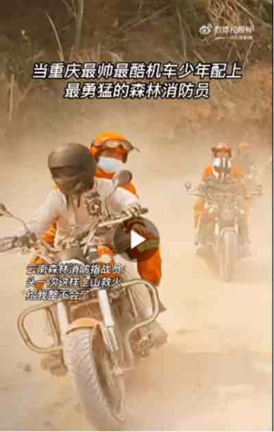当云南森林消防前来支援重庆山火救援工作时,发现山路陡峭,只能徒步上山,结果一个叫“龙麻子”的摩托车手在微信群里喊了一嗓子,瞬间北碚90%的摩托车都去了,摩托大军浩浩荡荡载着消防员们去往火场。