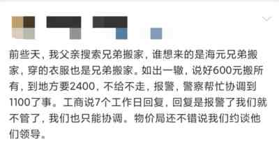 吴女士当时特别生气,暂且不说打电话咨询和口头约定时对方只字未提工时费的事情,当天搬家公司迟到多时,但迟到的时间也被算进了工时,以至于最终搬家费竟然涨了十倍。