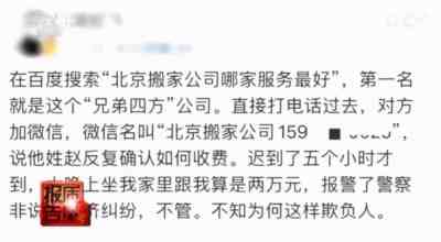 在丁先生遭遇坐地起价一个月后,北京的吴女士也被从网上联系的搬家公司狠狠坑了一把。