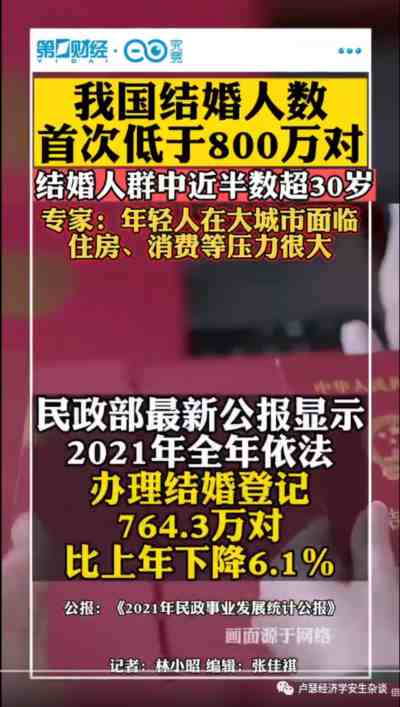 2003年以来结婚人数首次低于800万对,超30岁结婚人群占比近半——经济负担越来越重,结婚越来越难,越来越晚。即使不考虑养育孩子的成本,一对儿夫妻20岁结婚,35岁以前,理论上能生5+的孩子,30岁以上结婚,能生2个孩子就不错了。为什么人口下降,明摆着。