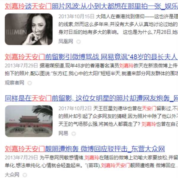 不大了解此事的人们,可以在百度上输入“刘嘉玲 天安门”便可搜得此事。或者看下面截图便可知一二。