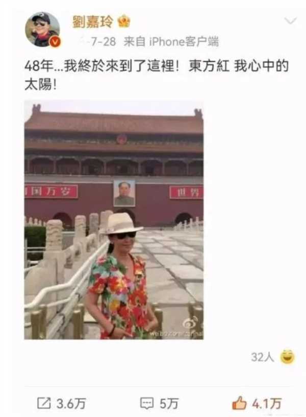 些年,香港明星刘嘉玲女士曾经到北京天安门旅行,她特意把自己与天安门城楼的毛主席像同框合影照片,兴高采烈的发到自己的微博上,还发表了自己崇拜&热爱毛主席的言论,谁想到竟然遭到反毛公知的围剿和群起网暴。