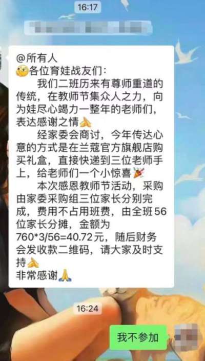 快过教师节的时候,广西柳州的一个家长群里,有家委会成员号召全班56位家长一起出钱给老师们买兰蔻礼盒。