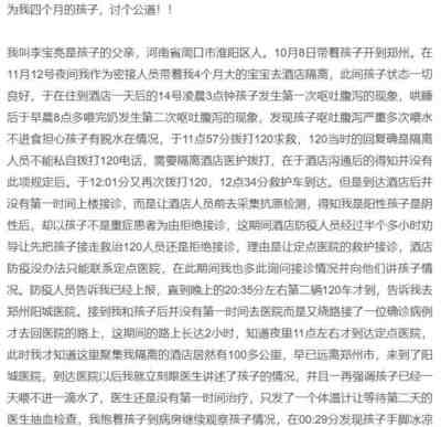 23点左右,到达定点医院,李宝亮才知道该定点医院并不在郑州,而是在登封。此时距离第一次拨打120电话已经过去11个小时,李宝亮告知医生孩子已经一天滴水未进,但对方只发了一个温度计让等待次日抽血检查。