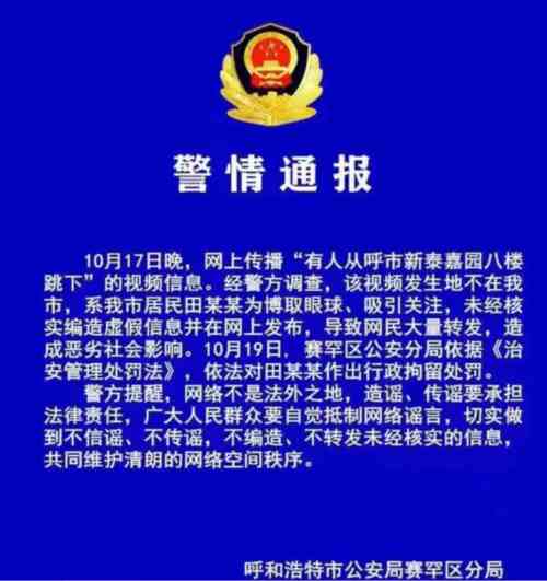 10月19日,赛罕区公安分局依据《治安管理处罚法》,依法对其作出行政拘留处罚,并通过官方媒体进行辟谣。