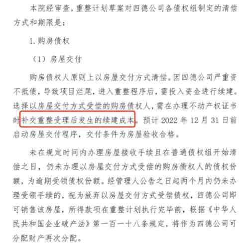 但灞桥区法院的裁定书是这样说明的:选择以房屋交付方式清偿有一定条件,那就是“因四德公司资不抵债,导致项目烂尾,进入重整程序后,需投入资金进行续建,选择房屋交付清偿的债权人,需在办理不动产权证书时补缴重整受理后发生的续建成本”。