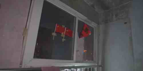 终于,进到了屋子,映入眼帘的是空荡又破败的土坯房, 唯一亮眼的是在窗户上那几面鲜红的五星红旗映衬下的远处万家灯火。