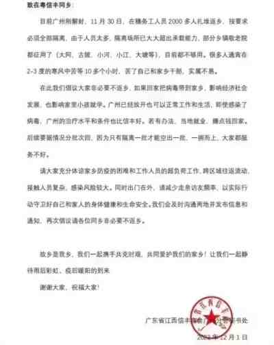 2,处于赣南的信丰县,由于大量在珠三角务工经商的人员返乡,哪怕未发现病例输入,但正常的隔离资源也被击穿。为此,广东省江西信丰商会广州分会发布了一封致在粤同乡的公开信,考虑到家乡实际情况,非必要不返乡。下面是公开信原文,点击可放大阅读。