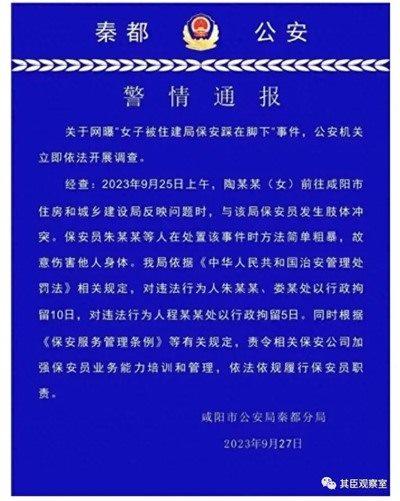 9月27日,陕西秦都公安发布通报,全文如下:关于网曝“女子被住建局保安踩在脚下”事件,公安机关立即依法开展调查。