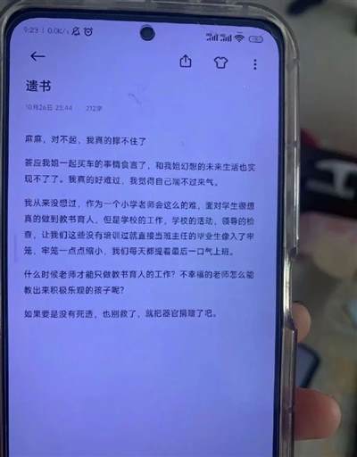 根据遗书及其与姐姐日常的聊天记录来看,教学任务以外的各种任务实在是太多,包括且不限于写宣传稿,准备各种材料,应付上级检查。相比之下,备课、上课似乎成了最不重要的那一部分。