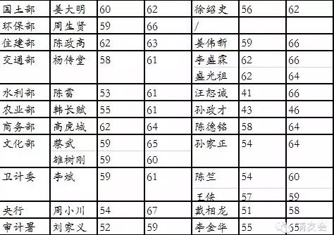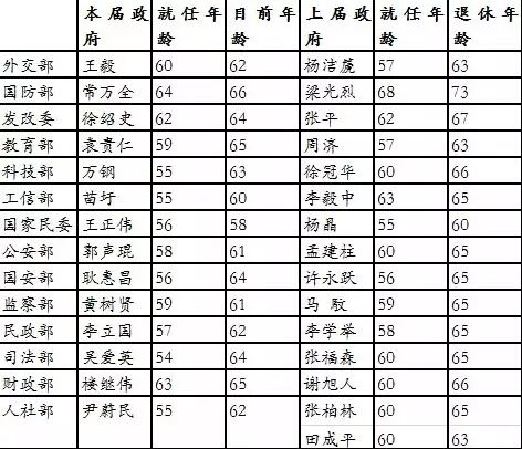 这是道硬杠杠,原则上,部长的退休年龄为65岁,考虑到5年一个任期,一般新部长的人选都尽量控制在60岁以下。当然,超过60岁就任的部长也不在少数,其中大部分是针对一些特别重要职位、暂时又没有合适年轻人选的过渡安排,比如本届政府中的发改委主任徐绍史(62岁上任)、财政部长楼继伟(63岁上任)、国防部长常万全(64岁上任)、商务部长高虎城(62岁上任)。