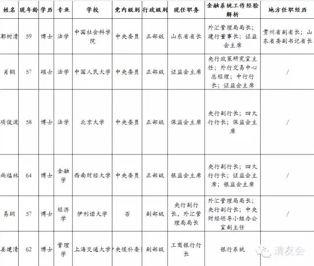 从央行行长来看,戴相龙和周小川上任时分别为51和54岁,任期分别为7年和13年。显然,在央行行长的人选上,中央更希望选择一个相对年轻的人选,这样其任期可以更长,以便于在复杂的内外环境中保持货币政策的连续性和稳定性。中央之所以让65岁的周小川继续站岗,很大程度上也是这个考虑。因此,如果年龄超过60岁,出任央行行长的可能性就微乎其微了,从这点上说,现年59岁的郭树清并没有劣势,但似乎也没有太多优势。