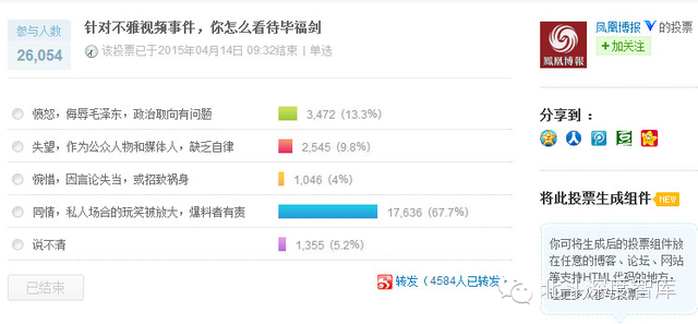 67.7%和33.3%,相差一倍,可以看出,@凤凰博报在微博上的投票,由于有@张鸣、@五岳散人、@深夜一只猫等大V和大V粉丝、水军帐号的参与,极大地影响了调查的客观性。