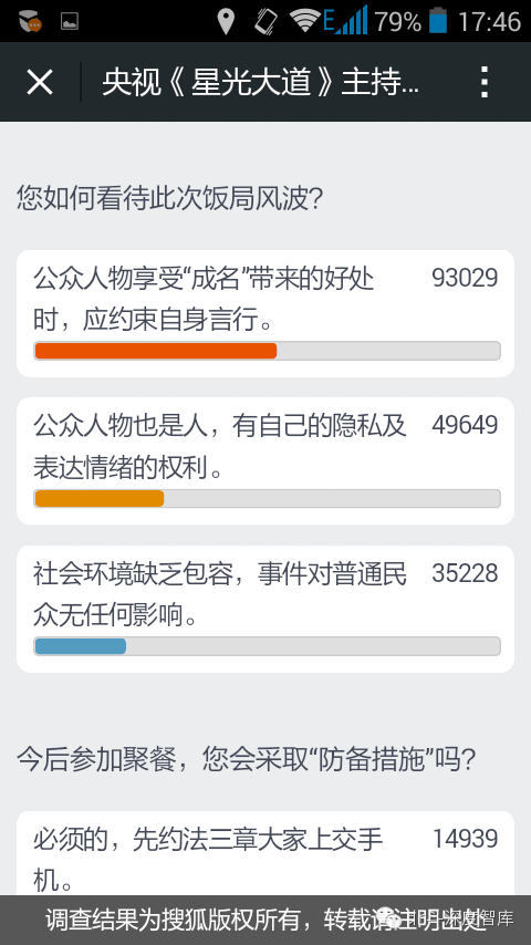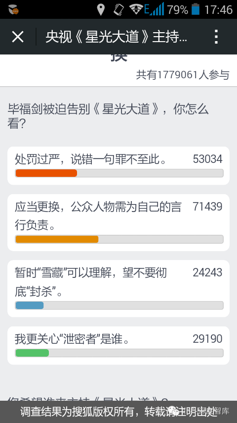 另外我们在贴出一次不同于微博的微信调查。搜狐新闻的微信客户端也有过一次调查,一共有17.8万人参与,认为《星光大道》应该更换毕福剑的人数最多,达到7.1万,而关心“泄密者”的人数最少,只有2.4万;同时,认为公众人物应该约束自己言行的有9.3万。调查结果截图如下: