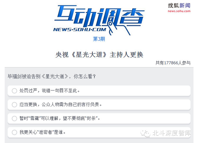 非常明显的是,由于微信水军技术尚未被研发出来,因此其投票结果比微博生态更接近真实的民意。搜狐的微信调查再次印证了凤凰网在门户网站上的调查结果。可以看出,多数民众对毕福剑持批评态度;也可以看出,微博舆论场由于长期以来践行“名人营销战略”,名人大V对微博舆论的影响力太大,加上水军的参与,在这次老毕事件中呈现出一片挺毕的态势,并不真实。大多数民众的不同意见、不同声音无法被有效地代表,从而无法发出。通过这次舆论事件,也对微博舆论场提出了一个问题,长期践行“名人战略”,可能会较大地影响到微博作为公众舆论场的有效代表民意、有效反映民意的功能。