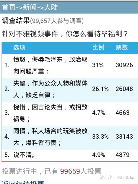 但是,凤凰网在门户网站上同样发起了一次投票(10万人参与),可是结果却截然相反,“同情”毕福剑的只有33.3%。