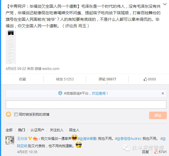在4月15日环球时报官微微博【朱军或暂代毕福剑主持《星光大道》】下面,最热门的评论是“毕福剑就这么被文革了?”同时我们也发现,在@中国青年网官微微博【毕福剑欠全国人民一个道歉】下面的最热评论中,是一条“我欠毕福剑一通掌声”的评论。