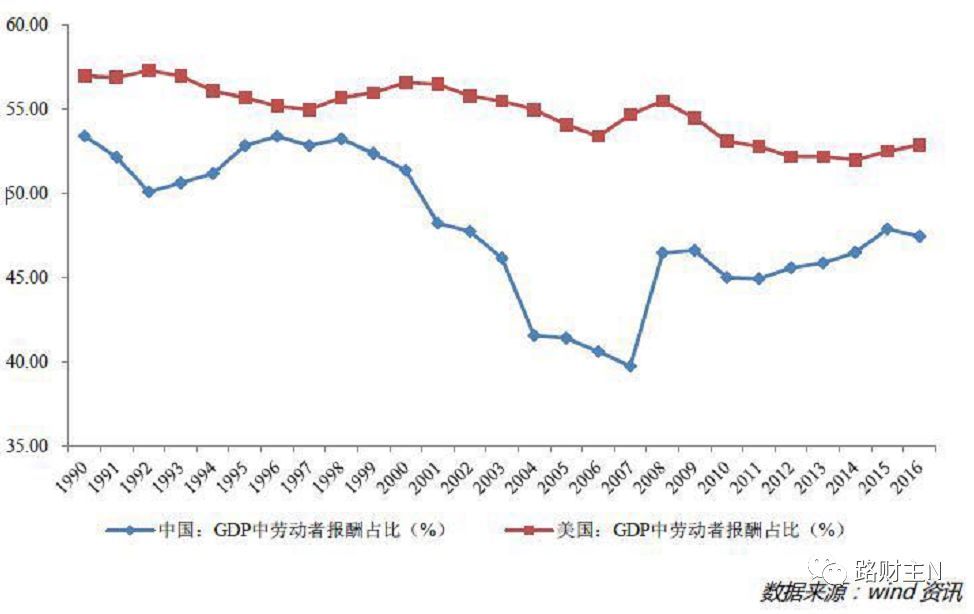 第二幅图,是28年来中国和美国劳动者报酬占GDP比重的对比。