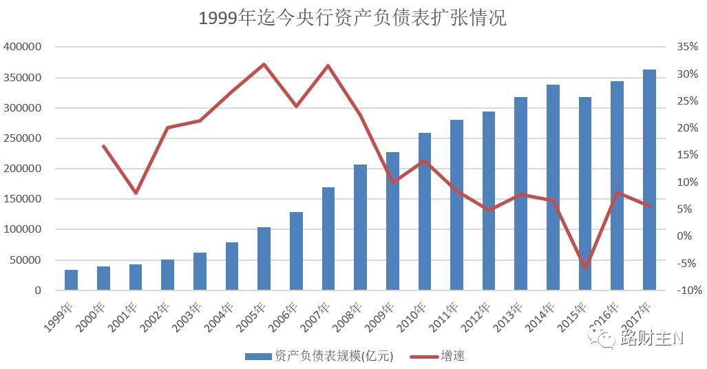 从第一幅图可以看出,1999年以来,央行的资产负债表从3.3万亿元变化到36.3万亿元,