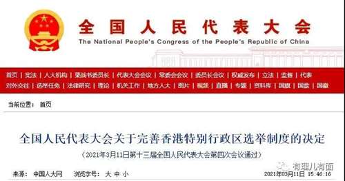2021年全国人大为了香港能回到正轨,作出了《完善香港特别行政区选举制度的决定》,在制度上,堵塞了外国势力、乱港势力通过配票的方式进入立法会,甚至染指特首选举的漏洞。