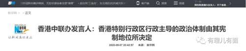 2020年中联办重申,香港是“行政主体”体制,借所谓“三权分立”否认“行政主导”,误导香港社会对政治体制的认知,削弱行政长官的宪制地位和权力,根本目的是抗拒和架空中央对港全面管治权,挑战特别行政区宪制秩序。