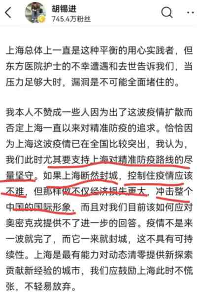 以墙头草著称的胡锡进,也站出来对上海的创新探索加油打气了。胡锡进说,我们此时尤其要支持上海对精准防疫路线的尽量坚守。如果上海断然封城,控制住疫情应该不难,但那样做不仅经济损失更大,冲击整个中国的国际形象,而且对我们目前该如何应对奥密克戎提供不了进一步的回答。