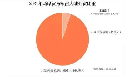 据海关总署统计,2011年两岸贸易额为1600.3亿美元,2021年两岸贸易额增长至3283.4亿美元,10年间两岸贸易额翻了一番。据台湾方面统计,两岸贸易额占台湾外贸比重从2011年的28.6%增长至2021年的33%。大陆稳居台湾地区最大出口市场和最大贸易顺差来源地。