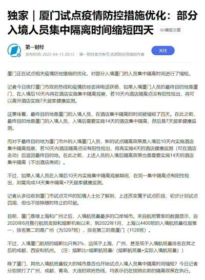 然而,昨天晚上依然看到了厦门试点缩短入境隔离时间的正式报道,入境隔离时间从“14+7”缩短为“10+4”(10天隔离4天健康监测):