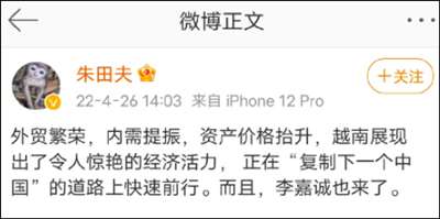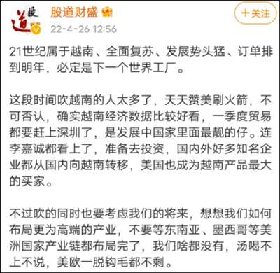 更有财经大V放话,“21世纪属于越南”,认为此时的越南已经全面复苏,订单都已经排到了明年,接下来越南会逐渐替代中国,成为新的“世界工厂”,中国再不采取行动,就连汤都喝不上了。
