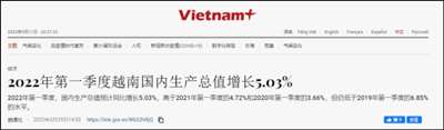 2022年一季度,越南GDP实现921.75亿美元,同比增长5.03%,高于中国的4.8%,GDP增速冠绝亚洲。