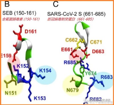 2、新冠病毒的刺突蛋白(S蛋白)存在与葡萄球菌肠毒素(SE)相似的成分,可模拟其作用。葡萄球菌毒素B是一种超级抗原,超级抗原可导致T细胞被无特异性地大量激活(激活约2-20%的T细胞),短时间内产生大量细胞引子,形成“细胞因子风暴”,造成剧烈炎症反应,重者可发生毒素休克综合征。
