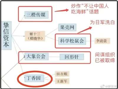 今天,挚信资本投资的机构中,除了丁香园,还有很多,比如科学松鼠会,因为给日军洗白已经被封;比如大象公会和回形针,是间谍组织,已经被取缔。