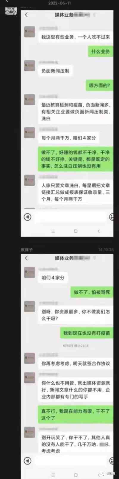 甚至有某核酸检测和疫苗公司花费6000万压制负面新闻,每月花2000万给传媒公司做负面新闻压制洗白,持续三个月,公司吃不下这单业务找合作方洽谈的微信聊天截图被曝出。