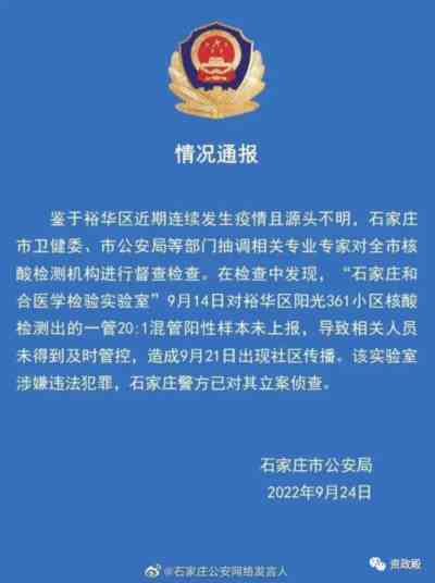 9月24日,石家庄市公安局发布情况通报称,鉴于裕华区近期连续发生疫情且源头不明,石家庄市卫健委、市公安局等部门抽调相关专业专家对全市核酸检测机构进行督查检查。在检查中发现,“石家庄和合医学检验实验室”(简称“石家庄和合”)9月14日对裕华区阳光361小区核酸检测出的一管20:1混管阳性样本未上报,导致相关人员未得到及时管控,造成9月21日出现社区传播。该实验室涉嫌违法犯罪,石家庄警方已对其立案侦查。