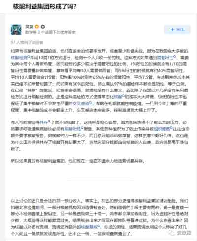显然,“产业链”的下游需求已经产生了! 在知乎上,有网友提出这样一个问题:“核酸利益集团形成了么?”一位网名叫“灵剑”的网友的回答获得了最多点赞。他从数学角度算了一笔账,也从另一个角度解释了核酸检测机构铤而走险违规作假的原因。