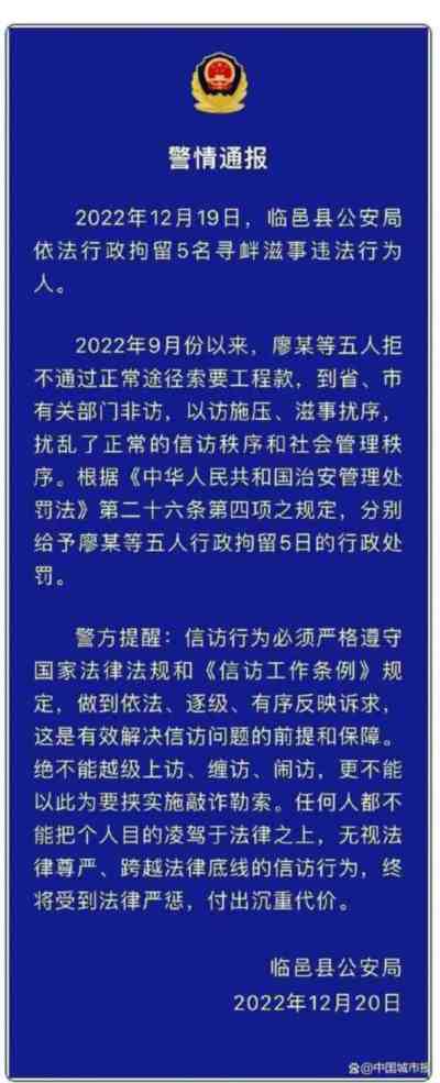 前不久,山东省德州市临邑县公安局发布警情通报:2022年12月19日,临邑县公安局依法行政拘留5名寻衅滋事违法行为人。通报称,2022年9月份以来,廖某等五人拒不通过正常途径索要工程款,到省、市有关部门非访,以访施压、滋事扰序,扰乱了正常的信访秩序和社会管理秩序。