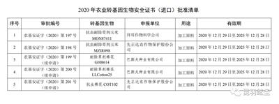 2019年12月30日,农业农村部科教司发布公告,公示了拟批准颁发农业转基因生物安全证书的192个植物品种目录,其中189个品种为棉花,另有2个玉米品种和1个大豆品种。