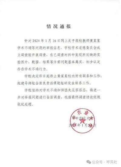 目前可以确定的是,黄飞若教授确实存在学术不端问题,对此学校官方也已启动调查程序,并公布了处理结果:将黄教授停职。