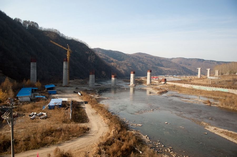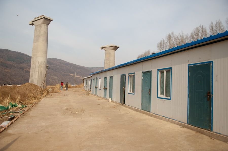 2009年6月,沈阳铁路局对“靖宇至松江河线工程”项目进行公开招标,中国中铁九局集团有限公司中标,随后将这一工程分割为多个标段分包,其中一家江西昌厦建设工程集团公司又将工程包给几个并无资质的农民工队伍。图为工程现场,十几根50米高的桥墩矗立在头道松花江湖畔,现场已看不到任何施工人员。