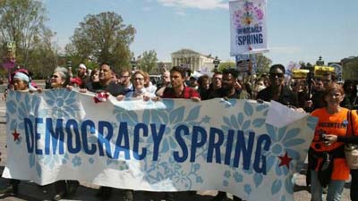 “民主之春”4月2日拉开帷幕,抗议者队伍从象征美国独立的费城独立钟出发,一路抵达华盛顿。从11日至18日,每天都有众多示威者因“非法示威、集会、妨碍司法”被逮捕。